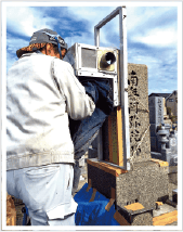 サンドブラストとは、字の如くサンド…砂(金属の粉の場合もある)をブラスト…吹き付けることで、石やガラス・木等に文字や絵を彫っていく工法のことです。これを用いることにより、より精密な文字や形を彫ることが可能になり、たとえばお墓に刻む文字や絵を故人様が書かれたとおりに再現できるようになったのです。墓地内にある霊標に新しい仏様の戒名を刻む時にもこの工法を用いれば、早く・安くできるようになりました。当店では、墓石のみならず各種看板の製作にもサンドブラストを用いています。